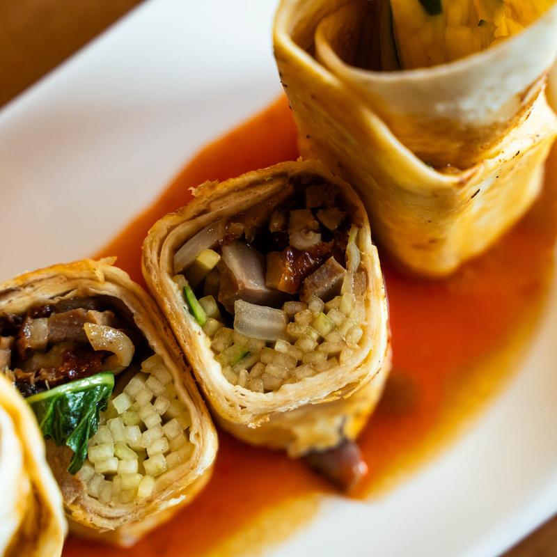 Roasted duck meat and vegetables, wrapped in tortilla w. miso sauce